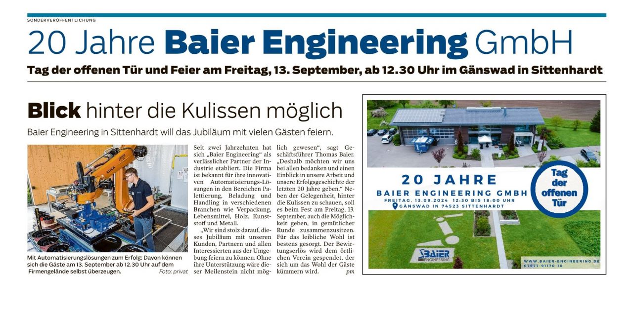 Presse Artikel über 20 Jahre Baier Engineering GmbH